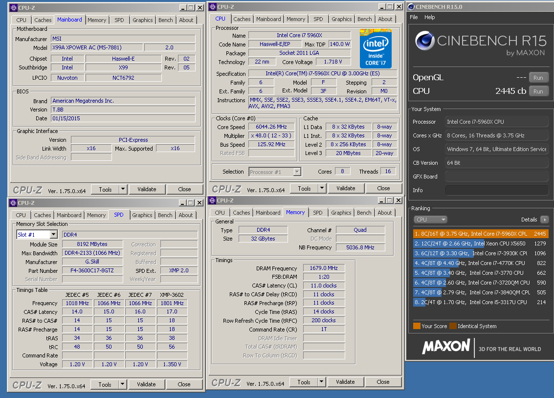 Переходящий золотой кубок (естественно, виртуальный) в дисциплине «Cinebench R15 на Core i7-5960X» отправляется в Бельгию к The Overclocking Knights. Дождавшись, пока маститая публика сосредоточится на попытках разгона нового Core i7-6950X (Broadwell-E), бельгийцы опубликовали результат в 2445 очков.