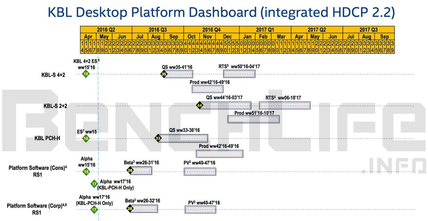 Новая технологическая дорожная карта, опубликованная китайским ресурсом BenchLife, не вносит ясности по данному вопросу. Согласно ей, первая партия RTS (ready-to-ship, т. е. готовые к отправке) экземпляров четырёхъядерников Kaby Lake-S будет выпускаться с 50-й недели 2016 года по 4-ю неделю 2017-го. Теоретически, если первые чипы будут готовы 12 декабря или несколькими днями позже, у Intel будет время для официального анонса и дебютных поставок, но учитывая ту неторопливость, с которой чипмейкер подходит к выпуску Kaby Lake, вариант с CES 2017 более вероятен. К слову, в 2017-м торжества по случаю Китайского Нового года начинаются уже 28 января, поэтому затягивать с премьерой и поставками Kaby Lake-S в Intel также вряд ли станут.