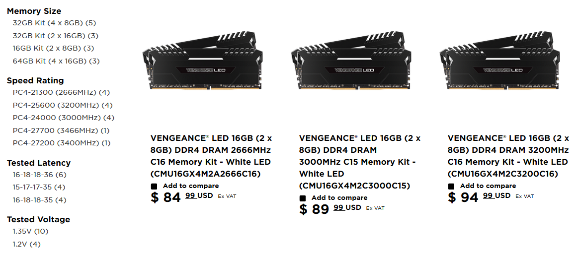 В линейке Corsair Vengeance White LED имеются четыре набора с напряжением 1,2 В, тогда как среди Vengeance Red LED таковых три. Оба семейства — «белые» и «красные» — также включают по 10 комплектов ОЗУ с рабочим напряжением 1,35 В.