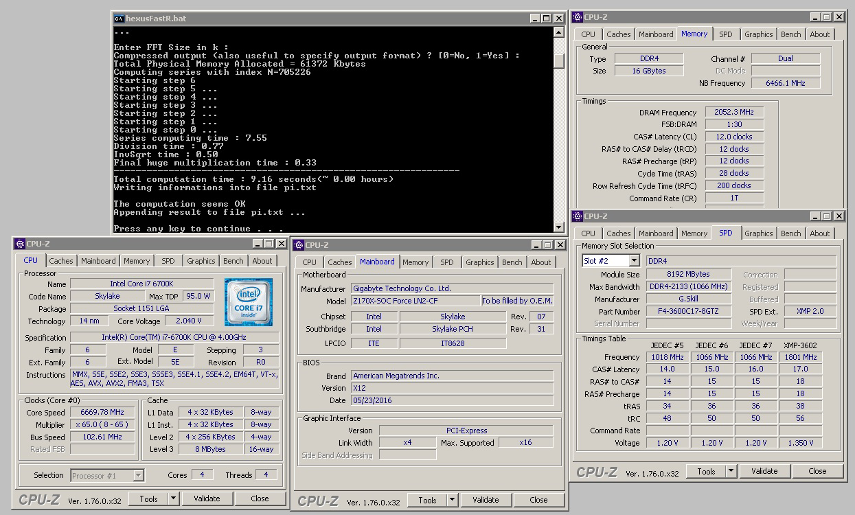 Новый рекорд помогли установить следующие комплектующие: материнская плата Gigabyte GA-Z170X-SOC Force LN2 (секретное оружие оверклокеров, сотрудничающих с Gigabyte Technology), вышеназванный четырёхъядерный CPU (на частоте около 6875 МГц, без Hyper-Threading) и два модуля памяти G.Skill DDR4, функционировавших на эффективной частоте более 4 ГГц с задержками 12-12-12-28. Блок питания и SSD-накопитель были предоставлены компанией Corsair.