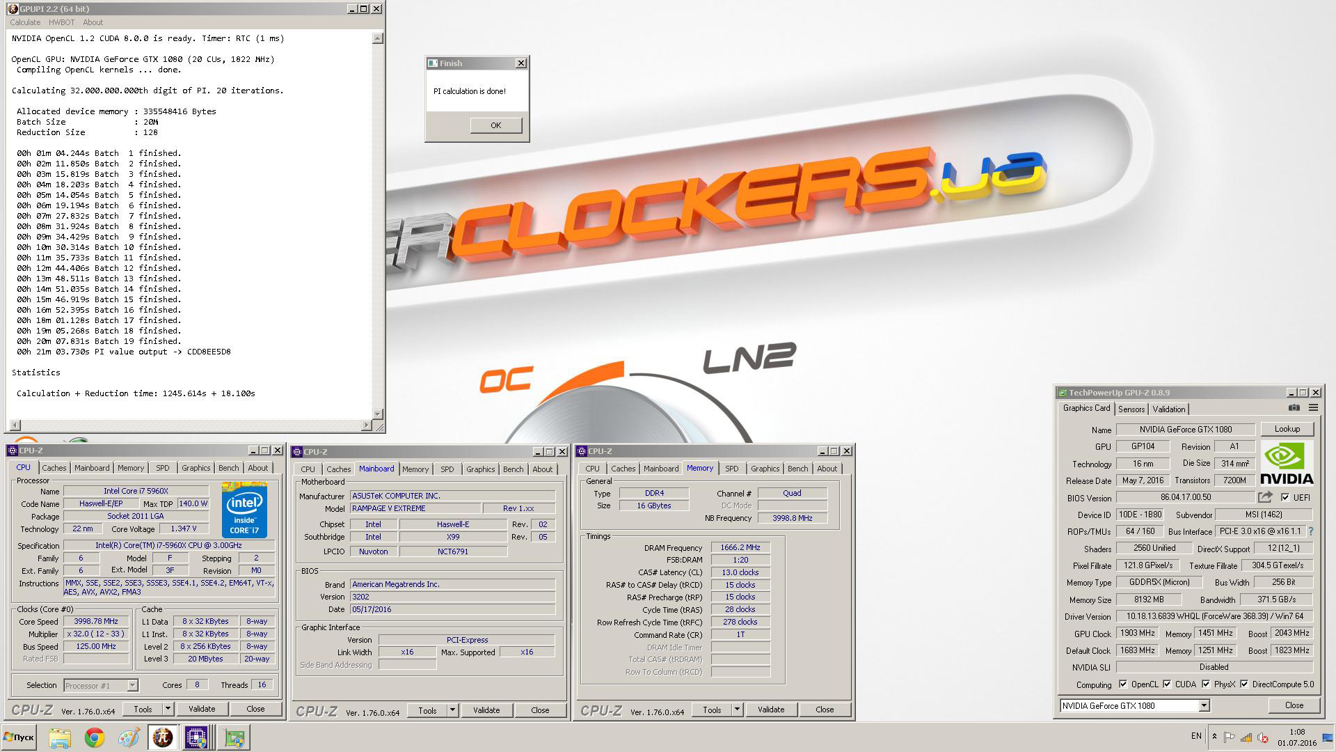 Сильнейший украинский оверклокер SergeyR, входящий в ТОП-50 участников HWBot, занял первые места в тестах GPUPi 1B (16,214 секунды) и GPUPi 32B (21 минута и 3,730 секунды) на карте GeForce GTX 1080.