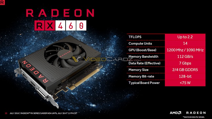 Примечательными особенностями Radeon RX 460 являются низкий номинальный уровень TDP, составляющий меньше 75 Вт, и отсутствие разъёма дополнительного питания.