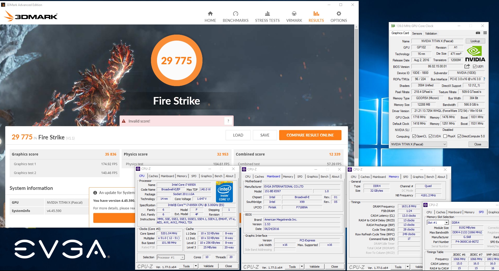 В бенчмарках 3DMark Fire Strike Ultra и 3DMark11 Perfomance видеокарта GeForce GTX Titan X Pascal была разогнана по ядру до 2176 и 2190 МГц соответственно, благодаря чему были достигнуты результаты в 8771 балл в первом и 41267 баллов во втором случае.