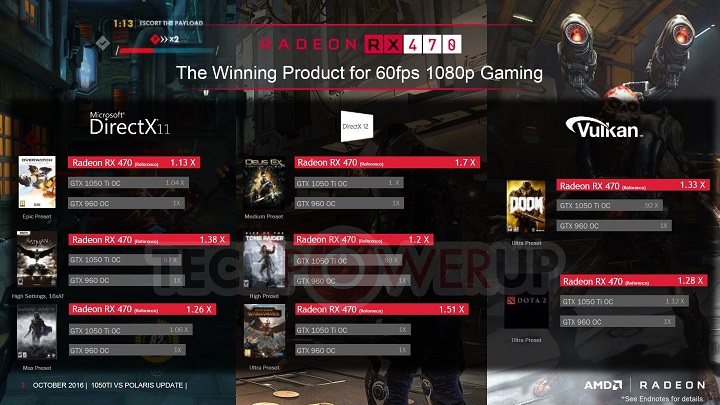 В скором времени состоится битва между AMD Radeon RX 470 и Nvidia GeForce GTX 1050 Ti за звание «народной видеокарты» для 1080р-гейминга. На днях стало известно, что «красный» чипмейкер снижает цены на видеоускорители Radeon RX 460 2GB и RX 470 на 10 долларов. Вслед за этим веб-ресурс TechPowerUp опубликовал официальные слайды AMD, где приводится сравнение производительности вышеупомянутых графических адаптеров. Наиболее интересным является тот факт, что AMD больше рассказывает о производительности новых видеокарт серии GeForce GTX нежели сама Nvidia.