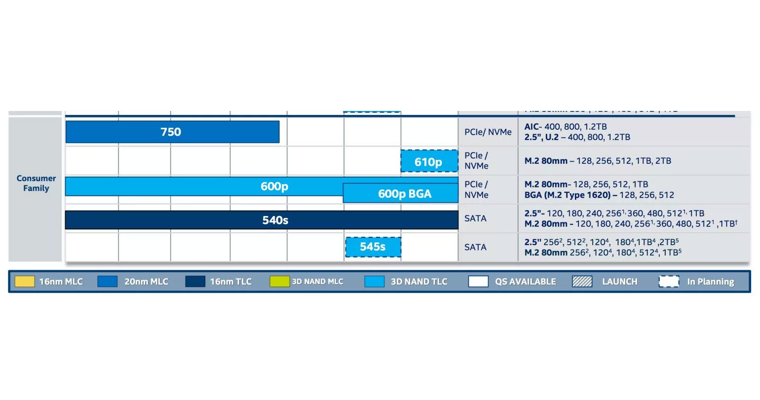 Как сообщает китайское веб-издание Benchlife, линейка твердотельных накопителей Intel 610p выйдет в последнем квартале следующего года и будет представлена моделями объёмом от 128 ГБ до 2 ТБ. Новинки получат микросхемы памяти TLC 3D NAND, производство которых будет осуществляться силами совместного предприятия Intel и Micron, известного как IM Flash Tecnologies.