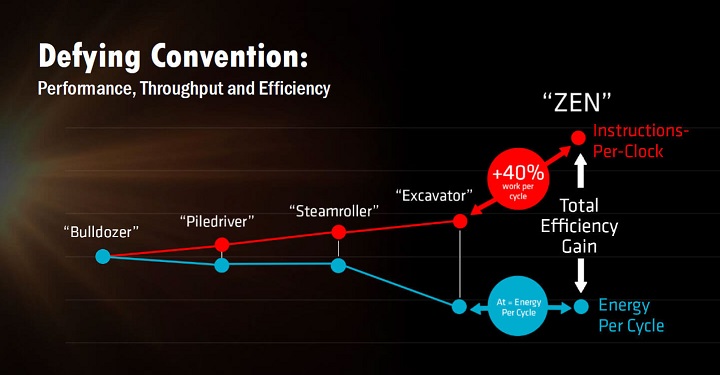 При разработке архитектуры Zen чипмейкер ставил перед собой цель обеспечить 40-процентный прирост количества обрабатываемых инструкций за такт относительно процессоров Excavator, однако, по словам главы AMD Лизы Су (Lisa Su), новые CPU могут похвастаться гораздо большим приростом производительности. Выход процессоров Ryzen состоится в первом квартале следующего года.