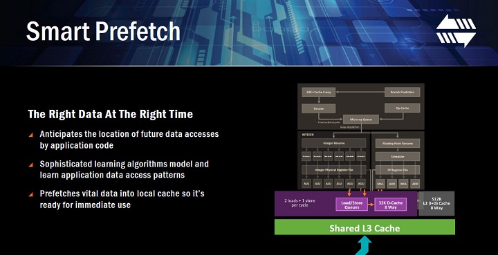Neural Net Prediction занимается предсказанием того, какие инструкции будут необходимы программе на следующем шаге, а «умная» система кеширования Smart Prefetch обеспечивает быстрый доступ к наиболее важным данным.