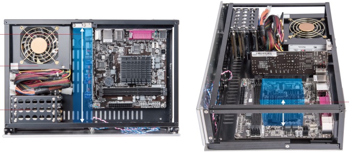 Внутри Abee AS Encolsure RS04 предусмотрено место для установки четырёх 2,5-дюймовых накопителей, блока питания форм-фактора SFX и процессорной системы охлаждения с высотой до 78 мм. Корпус также допускает установку одного низкопрофильного графического адаптера, наподобие Gigabyte GTX 1050 Ti OC, или другой низкопрофильной карты расширения, длина которой не превышает 190 мм.