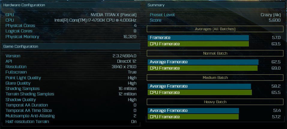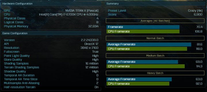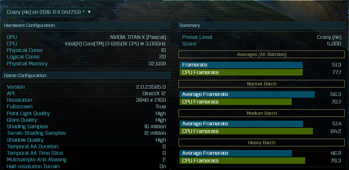 CPU работал в паре с одночиповым флагманом Titan X Pascal от компании NVIDIA, и смог обеспечить достойную производительность в пресете Crazy [4K], при высоких настройках графики.