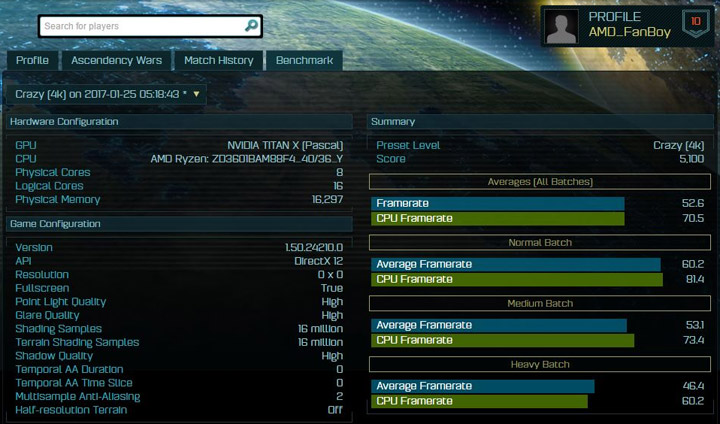 Для сравнения приведем результаты популярных процессоров Intel Core i7: 4790K, 6700K, 6950X, также взятые из базы данных AotS. Однако, стоит обратить внимание, что результаты для предрелизной версии восьмиядерного процессора Ryzen получены при использовании версии игры 1.50 и настроек Terrain Samples — 16M, Half-resolution Terrain — Off, в то время как приведенные данные для CPU Intel соответствуют версиям игры 2.0 – 2.3 с настройками Terrain Samples — 12M и Half-resolution Terrain — On.