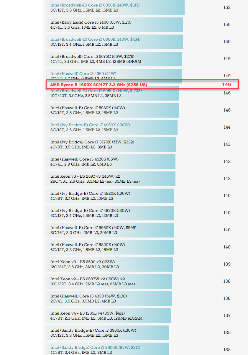 По итогам теста в Cinebench R15, процессору AMD Ryzen 5 1600X удалось набрать 146 баллов в однопоточном режиме. К слову, «камень» FX-9590 (Vishera), работающий на частоте 4,7 ГГц и характеризующийся номинальным TDP в 220 Вт, набирает в данном тесте всего 110 баллов. Для большей наглядности, на графике ниже приведены результаты процессоров Intel из базы данных портала AnandTech.