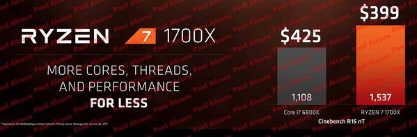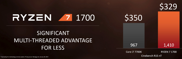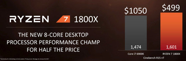 Также AMD поделилась результатами собственных тестов новых чипов в популярном бенчмарке Cinebench R15. На слайдах ниже чипмейкер из Саннивейла приводит сравнение результатов тестов и стоимости процессоров Ryzen с их аналогами от Intel. В целом, компании удалось получить внушительный уровень «сырой» производительности при значительно меньшей цене по сравнению с решениями конкурента.