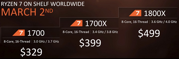 Спустя долгие месяцы спекуляций и слухов компания AMD наконец-то официально объявила о выходе семейства процессоров Ryzen. Первоначально новая линейка представлена тремя восьмиядерными моделями: Ryzen 7 1800X, Ryzen 7 1700X и Ryzen 7 1700, которые уже доступны для предварительного заказа у большинства партнёров AMD по всему миру. Розничные продажи новых чипов и системных плат к ним начнутся второго марта. Рекомендованная стоимость трёх первых процессоров Ryzen составляет $499, $399 и $329 соответственно.