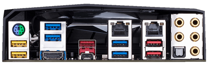 На задней панели расположены три разъёма USB 3.1 Type-A, один USB 3.1 Type-C, шесть USB 3.0, один PS/2, пара интерфейсов RJ-45, видеовыход HDMI, а также аудиоразъёмы.