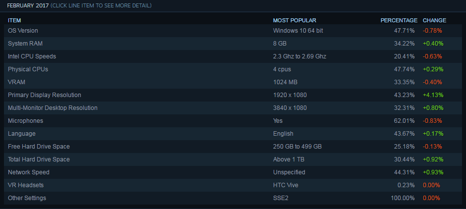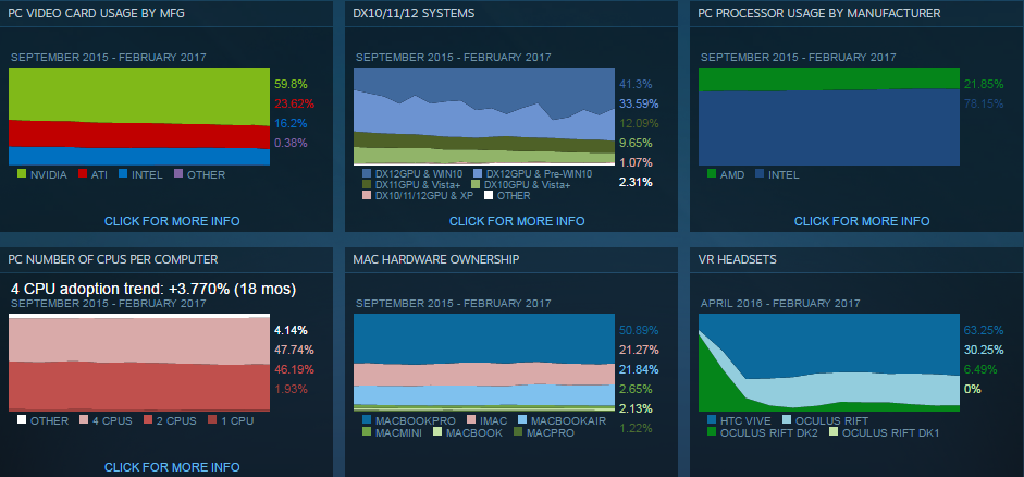 Что касается предпочтений геймеров в выборе графических адаптеров, то здесь чётко наблюдается переход от встроенных в процессоры Intel графических ядер, на дискретные видеокарты от AMD и Nvidia, доля которых увеличилась на 0,2% и 1,1% соответственно. Тем временем число систем, оснащённых «красными» CPU выросло на 0,3%. Любопытно, что данная статистика было собрана до релиза процессоров Ryzen и ростом популярности AMD обязана исключительно чипам прошлых поколений.