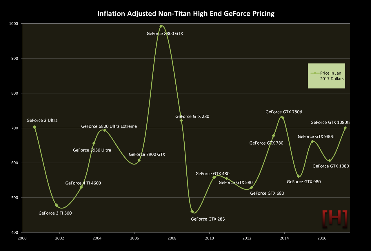В целом, стоимость игровых флагманов серии GeForce всегда находилась в одном и том же ценовом диапазоне. Так, видеокарта GeForce 2 Ultra в 2000 году предлагалась по цене, эквивалентной нынешним 700 долларам, что и современный флагман в лице GeForce GTX 1080 Ti, а самым дорогим игровым видеоускорителем на момент своего выхода является GeForce 8800 Ultra, который в настоящее время был бы оценён в $1000.