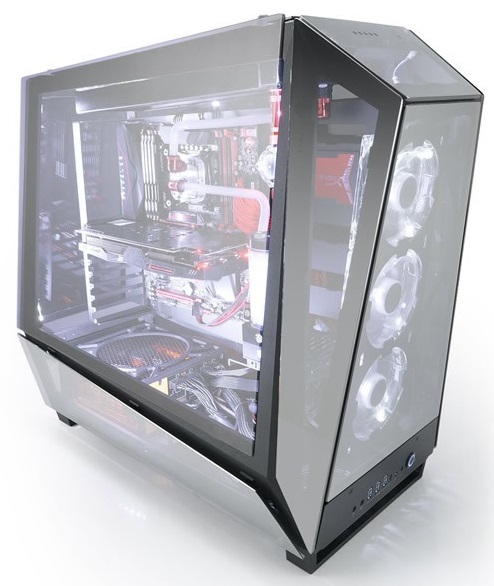 Новый корпус относится к классу Full-Tower, способен принять материнскую плату вплоть до формата E-ATX, а его каркас практически полностью выполнен из алюминия. Примечательной особенностью новинки являются панели из 5-мм закалённого стекла с зеркальным напылением, через которые можно наблюдать внутренние компоненты при включении светодиодной подсветки.