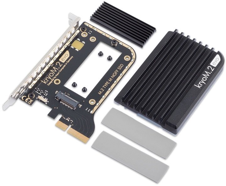 Aqua Computer kryoM.2 Evo представляет собой небольшую карту расширения PCI Express 3.0 x4, на которой размещается SSD формата M.2. С обеих сторон твердотельного накопителя при помощи двух термопрокладок и четырёх болтов устанавливаются два алюминиевых радиатора. Данное устройство в первую очередь должно приглянуться владельцам современных системных плат, лишённых разъёма M.2. Правда стоит учитывать, что при этом плата должна обладать поддержкой протокола NVM Express.
