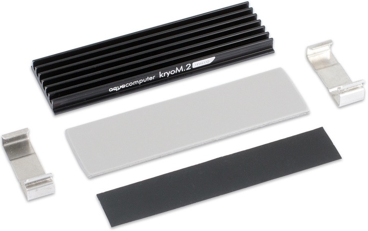 Тем временем kryoM.2 Micro является более доступным решением для владельцев NVMe-накопителей. Данный кулер представляет собой небольшой алюминиевый радиатор, устанавливаемый на SSD при помощи теплопроводящей накладки и двух металлических скоб с чёрной изолирующей прокладкой. Охладитель kryoM.2 Micro доступен по цене в 10 евро.