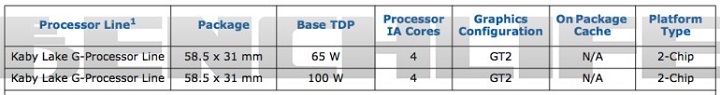 Линейка процессоров Kaby Lake-G изначально будет включать две модели с номинальным тепловыделением 65 и 100 Вт. Каждый такой процессор будет объединять на одной подложке 14-нанометровый кристалл CPU с четырьмя вычислительными ядрами и кристалл GPU, оснащённый памятью HBM2. Для связи между двумя дискретными чипами будут использоваться восемь линий интерфейса PCI Express 3.0.