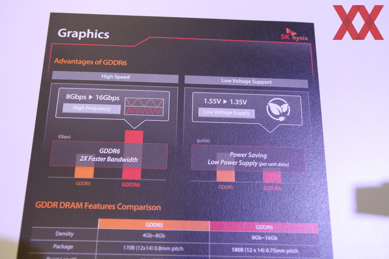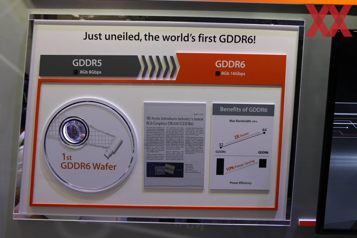 Компания SK Hynix привезла на конференцию GTC 2017, проходящую в настоящее время в Сан-Хосе, первые образцы микросхем памяти GDDR6, формальный анонс которой состоялся в прошлом месяце. Новые чипы найдут применение в графических адаптерах следующего поколения и обеспечат удвоенную пропускную способность и объём по сравнению с микросхемами GDDR5.