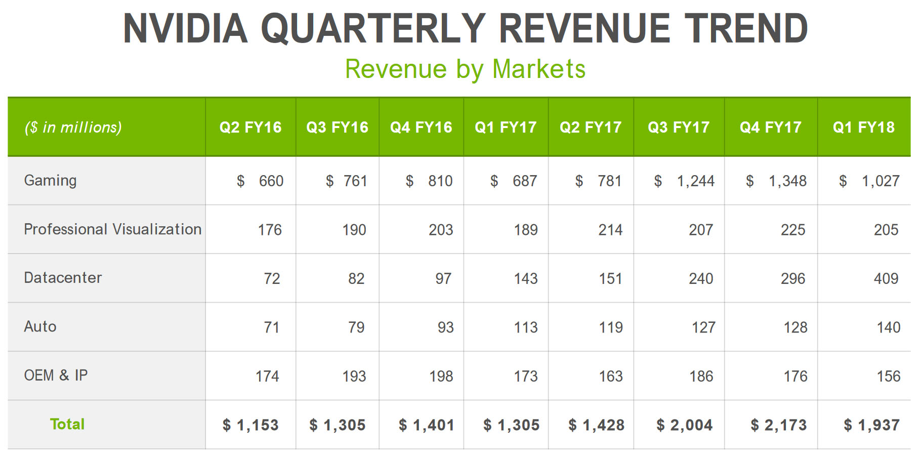 Что касается направлений бизнеса Nvidia, то здесь по-прежнему львиную долю (53%) выручки приносят продажи игровых видеокарт: за первый квартал их удалось продать на $1,027 млрд. Профессиональная графика принесла компании доход в размере $205 млн, продажи систем-на-чипе для «умных» автомобилей - $140 млн, а продукции для OEM-сегмента удалось реализовать на 156 миллионов долларов.