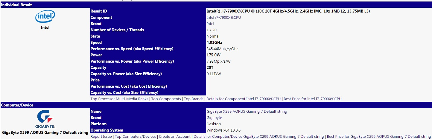 Протестированный экземпляр Core i7-7900X включал десять ядер с поддержкой Hyper-Threading, работающих на частоте от 4 до 4,5 ГГц (по всей видимости, здесь указаны частоты режимов Turbo Boost и Turbo Boost 3.0 – прим. авт.), 10x 1 МБ кэш-памяти второго уровня и 13,75 Мбайт общего кэша L3. Номинальный уровень TDP данного процессора составляет внушительные 175 Вт. В качестве основы для тестового стенда выступала ещё не представленная материнская плата Gigabyte X299 Aorus Gaming 7.
