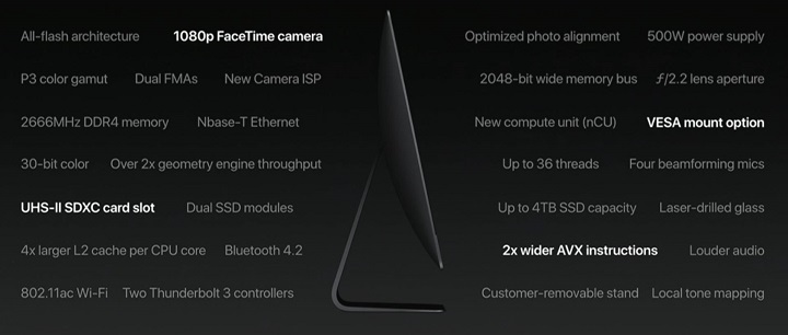 В качестве «сердца» новых iMac выступают двух- и четырёхъядерные процессоры Intel Kaby Lake, компанию которым составляют до 32 или 64 Гбайт оперативной памяти (в зависимости от диагонали), а также профессиональные графические адаптеры серии AMD Radeon Pro. В зависимости от модели новинки могут быть оснащены как 2-гигабайтной видеокартой Radeon Pro 555, так и Radeon Pro 580, располагающей восемью гигабайтами видеопамяти. Для хранения пользовательских данных предусмотрен твердотельный накопитель объёмом до 2 ТБ. С более подробными характеристиками устройств серии iMac можно ознакомиться на официальном сайте.