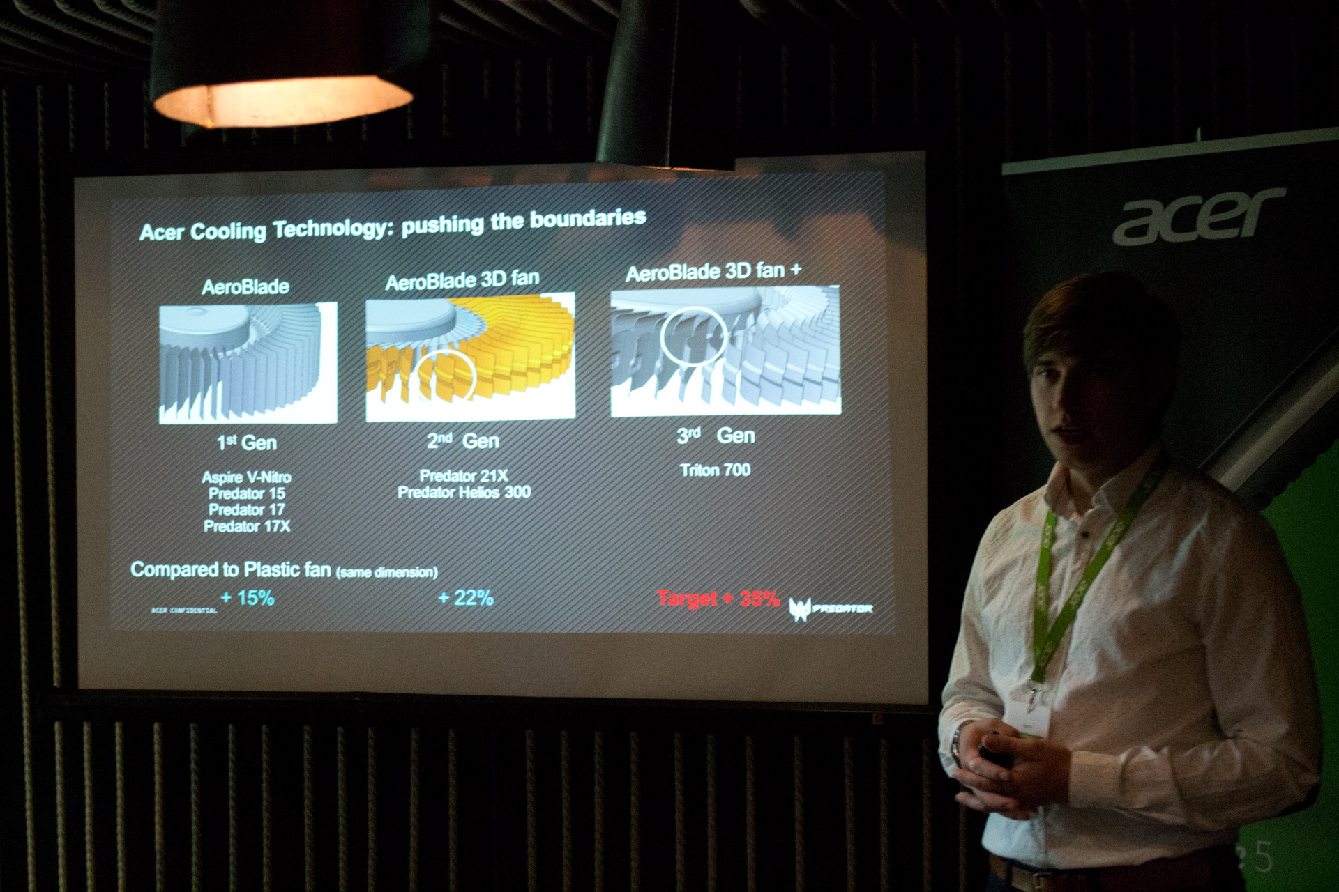 Однако больше всего внимания компания Acer отводит геймерским ноутбукам линеек Predator и Nitro. Первое «семейство» включает в себя модели среднего и высокого уровней, обеспечивающие производительность уровня «VR-Ready». Для более эффективного охлаждения внутренних компонентов инженеры компании разработали новый дизайн вентиляторов AeroBlade 3D.