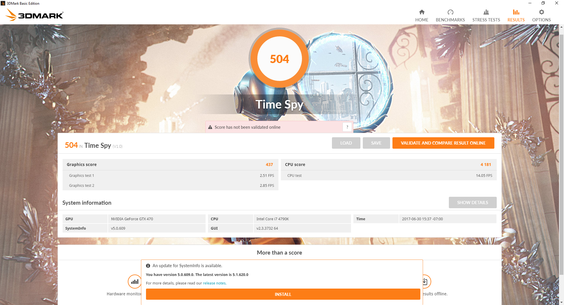 Бенчмарк 3DMark Time Spy вышедшей семь лет назад видеокарте GeForce GTX 470 удалось завершить со скромным результатом в 437 «попугаев» (Graphics Score). При этом средняя частота кадров составляла около 2,7 к/с.