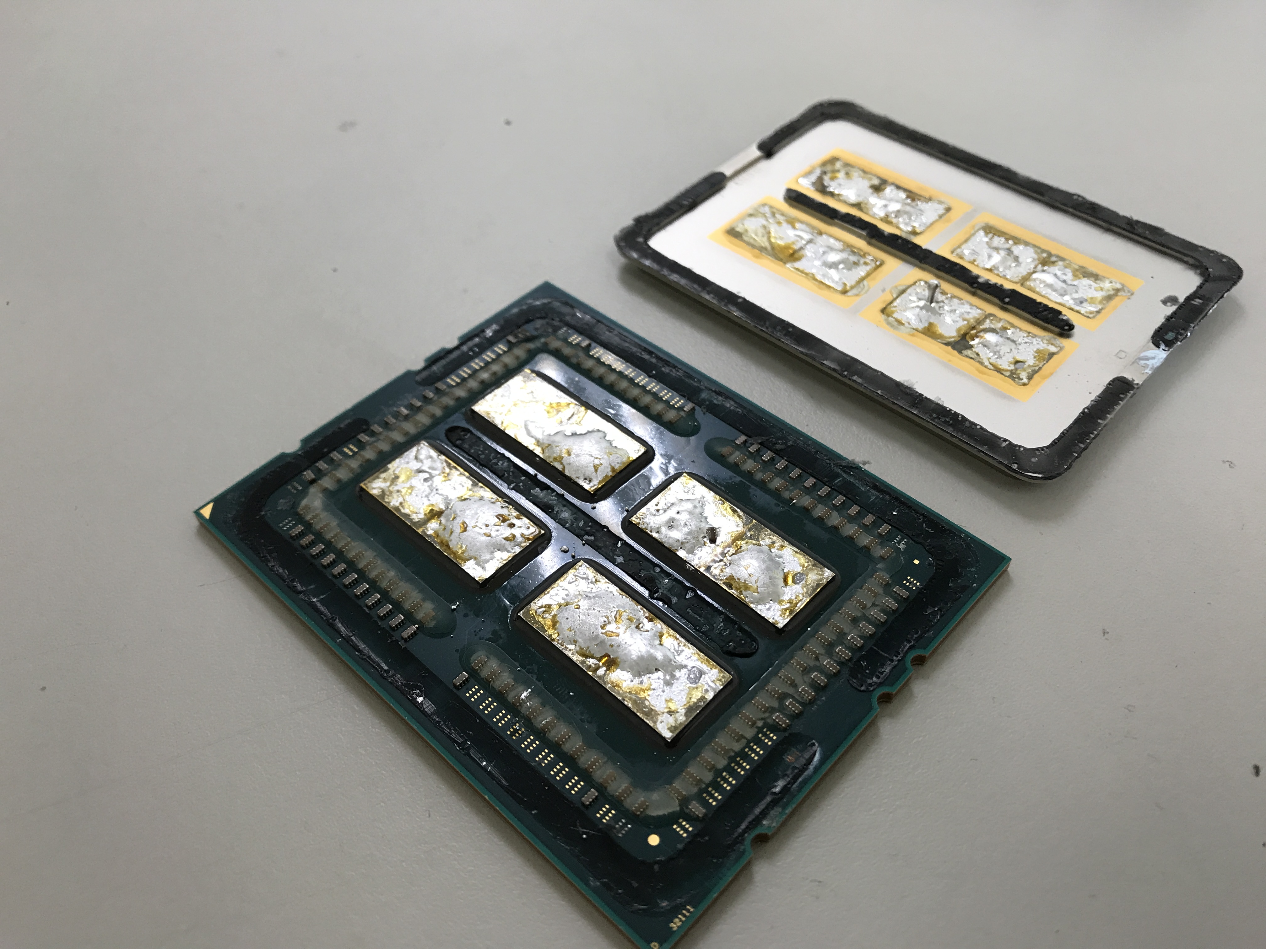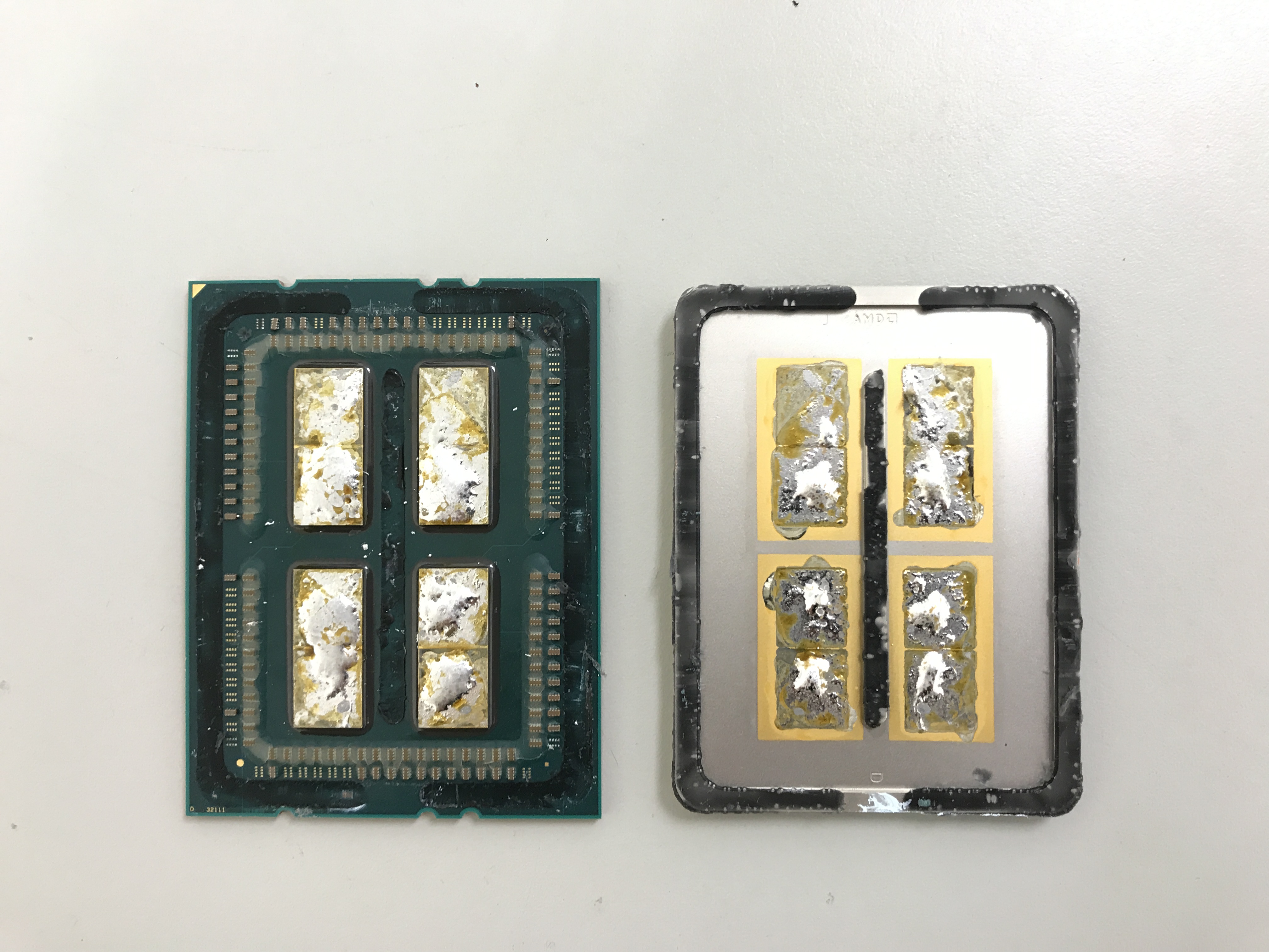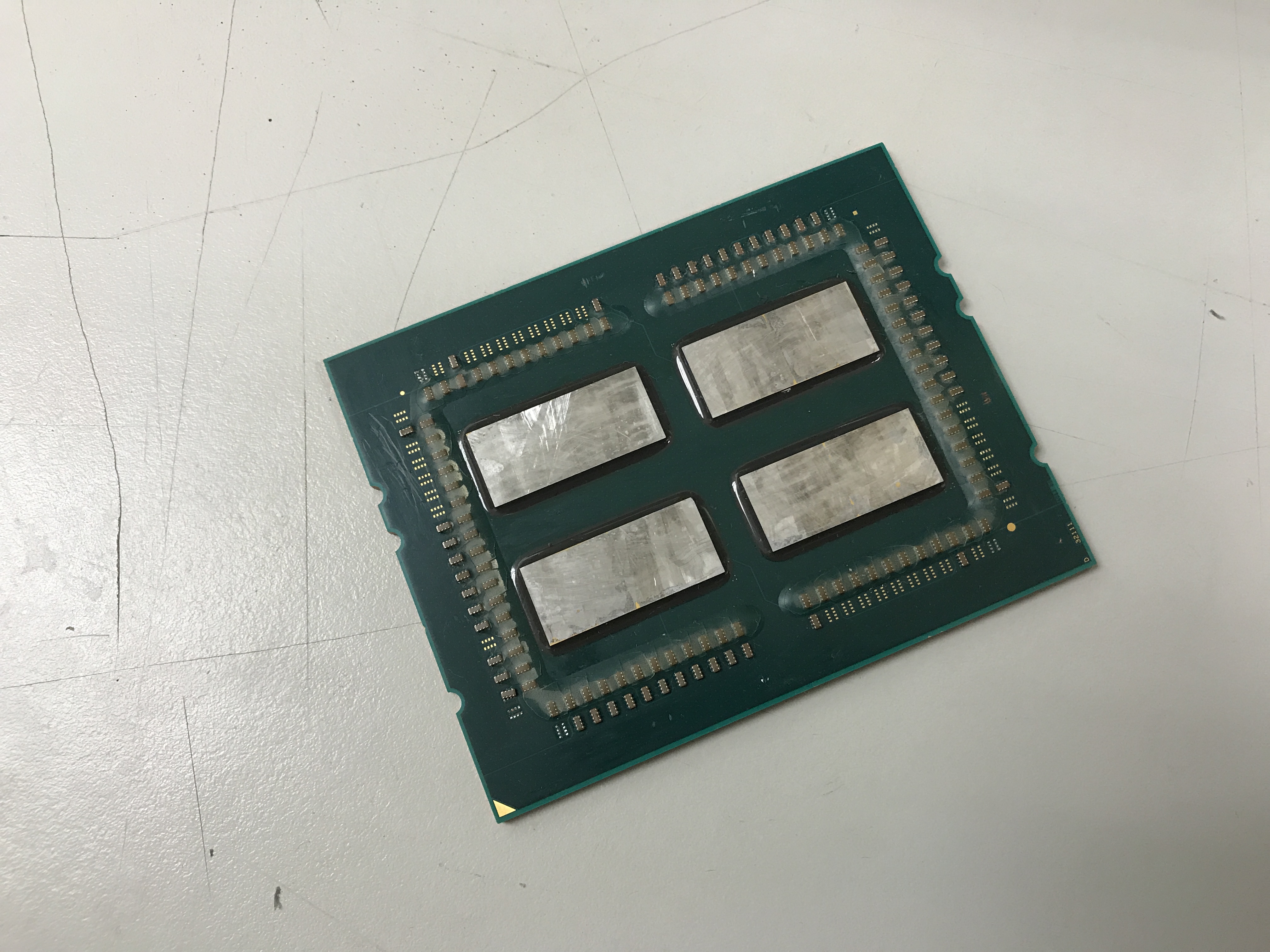 Крышка CPU была приклеена к текстолиту не только по периметру, но и по центру, между самих восьмиядерных кристаллов Zeppelin и чтобы её снять потребовалось немало усилий. Несмотря на нагрев до 188°C крышка не хотела покидать своё место и поддалась только после того, как Роман сильно надавил на неё паяльным феном.
