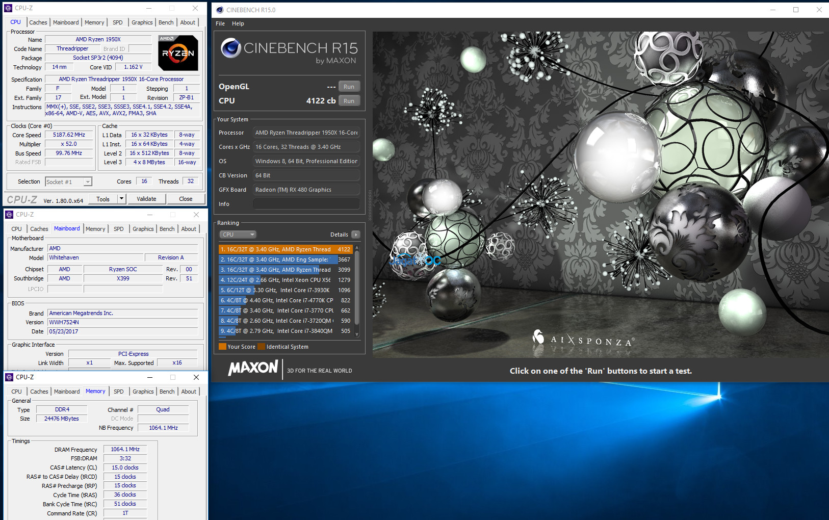 Напомним, что данный CPU располагает 16 ядрами с поддержкой SMT, четырёхканальным контроллером памяти DDR4 и функционирует на штатной частоте 3,4 ГГц (4 ГГц в турбо-режиме). Под жидким азотом процессор Ryzen Threadripper 1950X удалось разогнать до частоты 5187 МГц, сохранив работоспособность всех ядер. При этом температура «камня» опускалась до -190°C, а напряжение было увеличено до внушительных 1,55 В (согласно показаниям утилиты Ryzen Master).