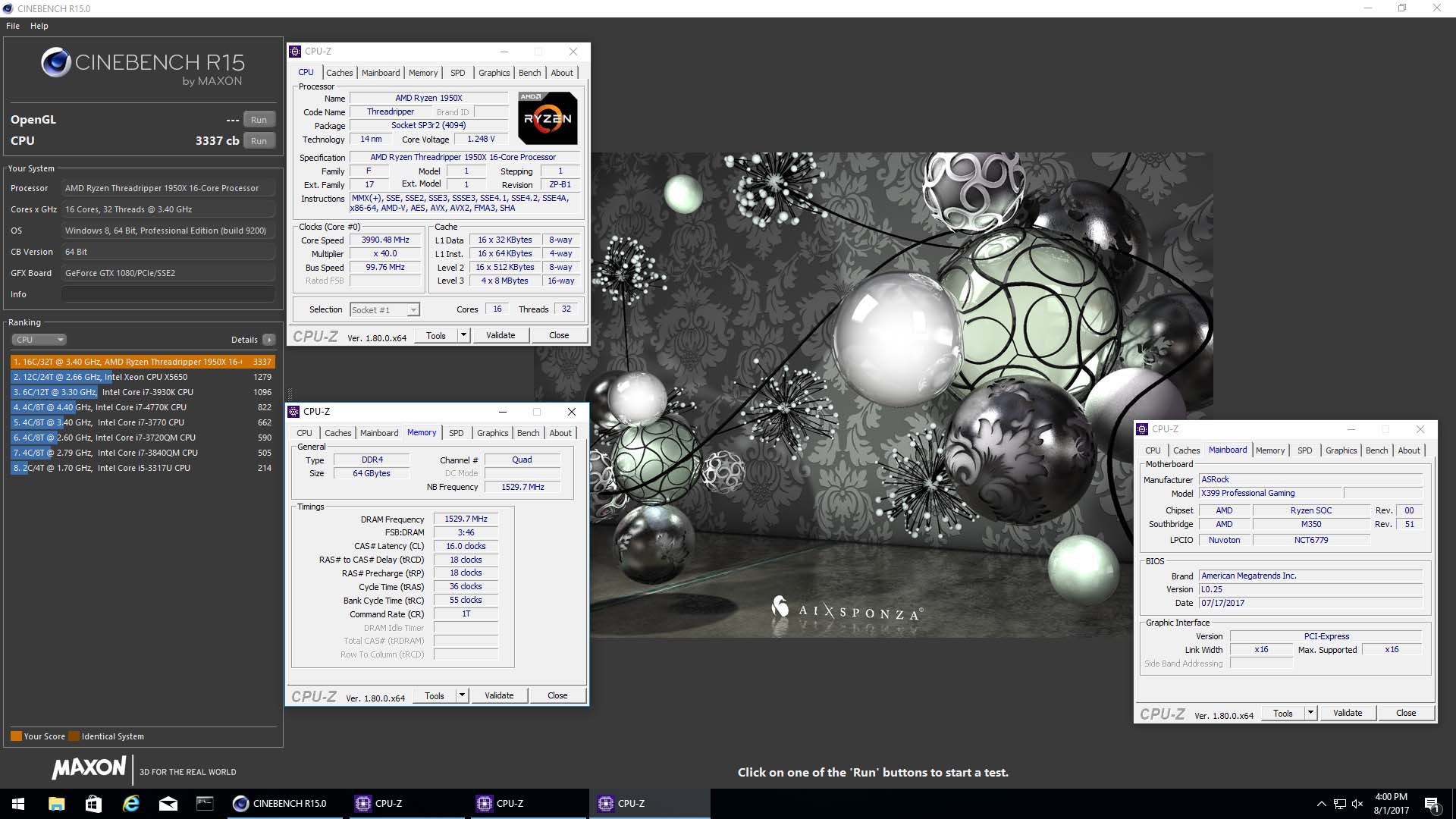 Установив напряжение питания равным 1,25 В процессор Ryzen Threadripper 1950X удалось разогнать до частоты 4 ГГц на всех ядрах. В таком режиме CPU сохранял высокую стабильность работы и завершил тест Cinebench R15 с результатом в 3337 баллов.