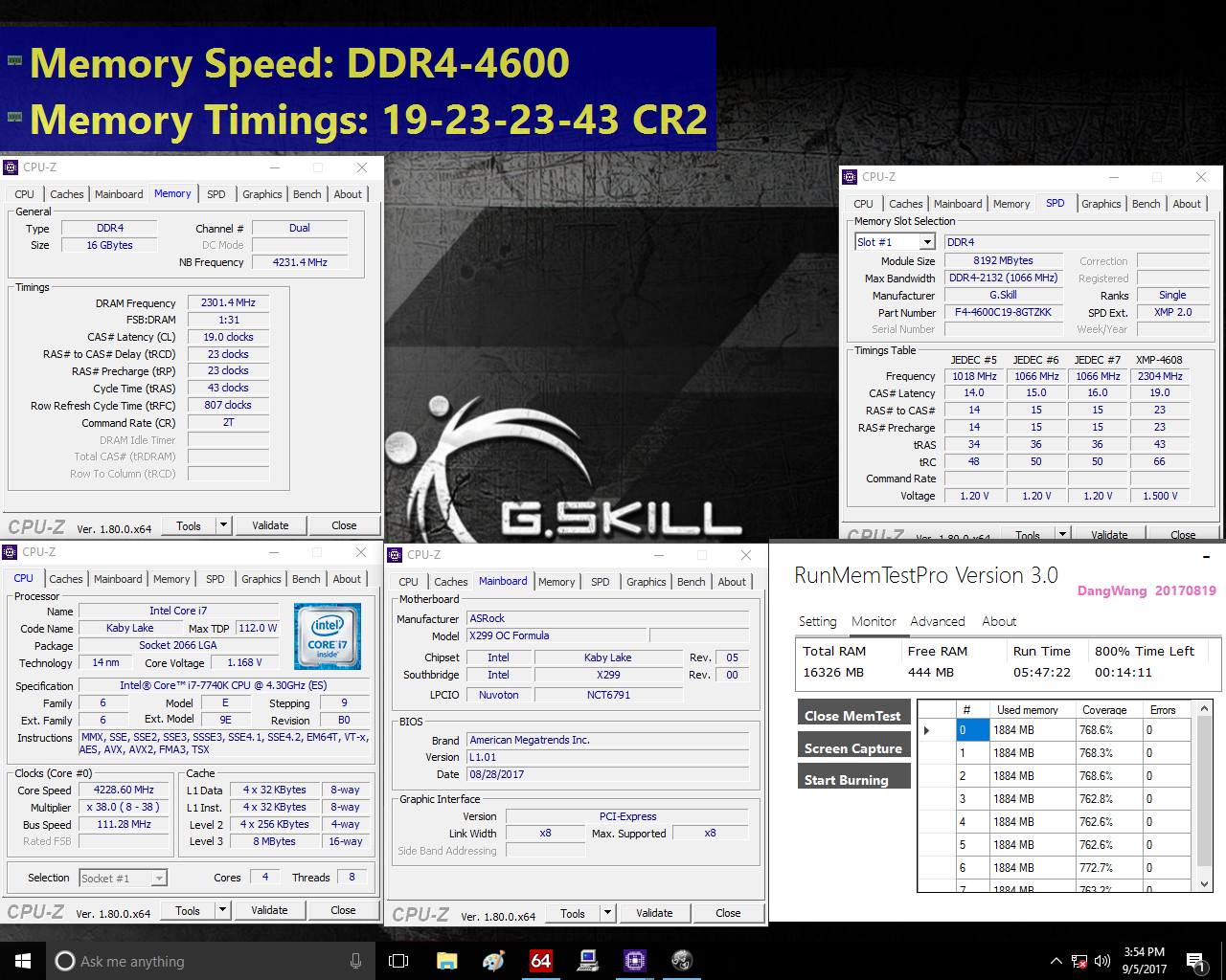 Модули G.Skill Trident Z DDR4-4600 оснащаются алюминиевыми радиаторами чёрного и серебристого цветов. Как отмечает производитель, наиболее оптимальным сочетанием компонентов для нового набора ОЗУ являются материнские платы на чипсете Intel X299 и процессоры Intel Kaby Lake-X. Ниже приведён скриншот 6-часового стресс-тестирования комплекта Trident Z DDR4-4600 на материнской плате ASRock X299 OC Formula с процессором Core i7-7740K.