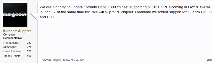 Представитель Eurocom на страницах форума NotebookReview проговорился о планах компании перейти на использование в портативных компьютерах Tornado F5 набора системной логики Intel Z390, релиз которого запланирован на вторую половину следующего года. При этом чипсет Intel Z370, первые платы на основе которого дебютируют уже в следующем месяце, канадский производитель решил вовсе обойти стороной. Что интересно, в топовой конфигурации данный ноутбук будет оборудован восьмиядерным процессором, способным обрабатывать до 16 потоков одновременно.