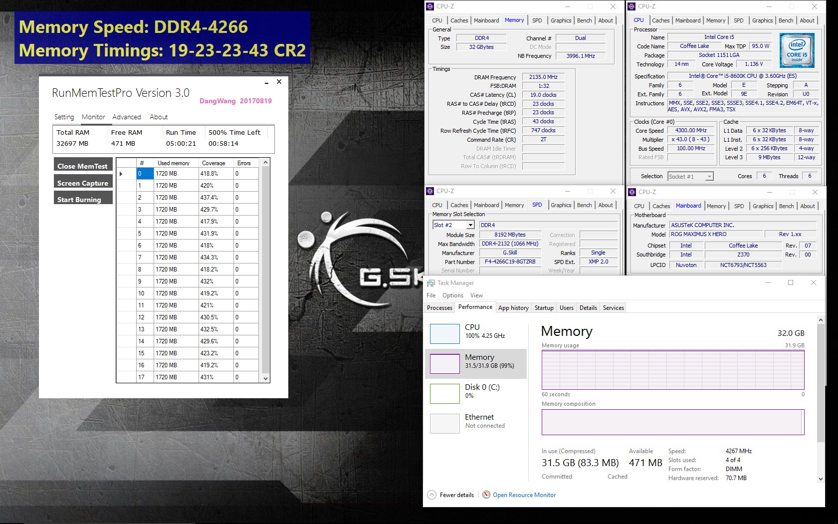 Новый набор Trident Z RGB DDR4-4266 успешно прошёл пятичасовой стресс-тест на частоте 4270 МГц в компании процессора Intel Core i5-8600K и материнской платы ASUS ROG Maximus X Hero.