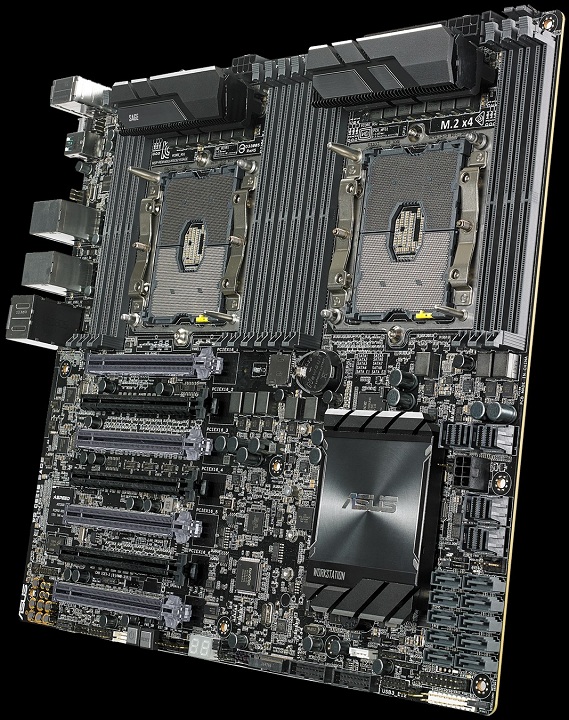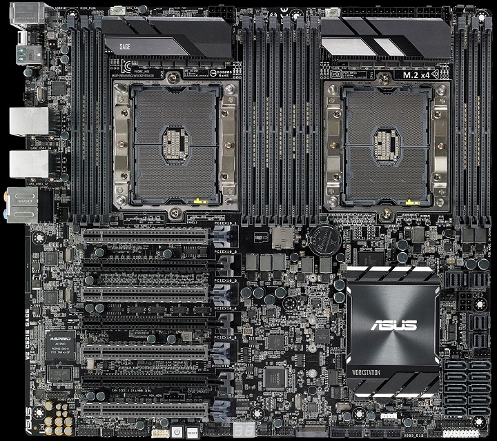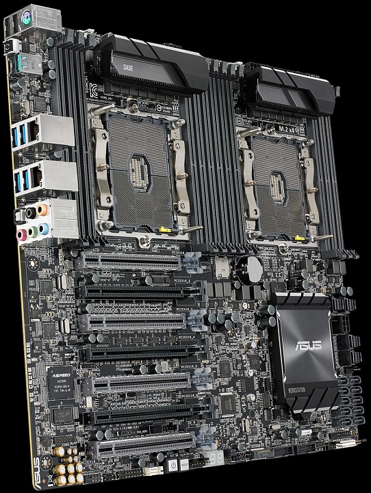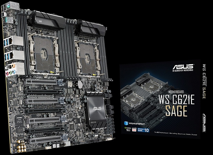 Компания ASUSTeK Computer объявила о скором появлении на прилавках магазинов своей новой флагманской материнской платы для рабочих станций — WS C621E SAGE. Новинка рассчитана на установку двух серверных ЦП семейства Intel Xeon Scalable вплоть до пары 28-ядерных Xeon Platinum 8180M, выполнена в форм-факторе EEB (305x330 мм) и позволяет создавать графические связки 4-Way SLI или 4-Way CrossFireX. С двумя процессорными разъёмами LGA3647 соседствуют 12 слотов для модулей оперативной памяти стандарта RDIMM DDR4 или LR-DIMM DDR4, а максимальный объём ОЗУ составляет 768 Гбайт.