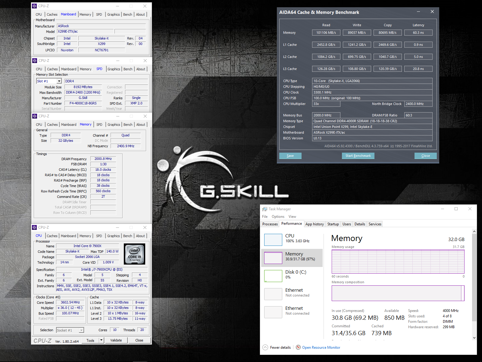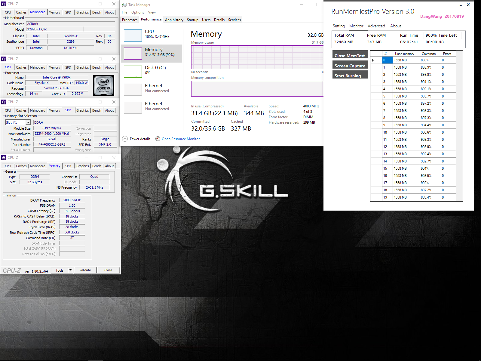 Оптимальным сочетанием компонентов для нового набора ОЗУ, по мнению G.Skill, является тандем из материнской платы на базе чипсета Intel X299 и процессора Intel Skylake-X. В качестве доказательства высокой стабильности комплекта приводится скриншот со стресс-тестом G.Skill Ripjaws DDR4-4000 на плате ASRock X299E-ITX/ac с процессором Intel Core i9-7900X.