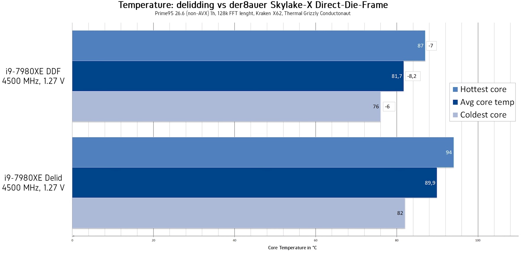 Что касается эффективности подобного охлаждения кристалла CPU «без посредников», то по сравнению с уже «скальпированными» чипами, у которых под крышкой находится жидкий металл, оно позволяет дополнительно снизить температуру процессора в нагрузке на 5-10°C. В частности, охлаждаемый с помощью СВО NZXT Kraken X62 процессор Intel Core i9-7900X, разогнанный до 4,3 ГГц, показал выигрыш в средней температуре около 6°C, а 18-ядерный Core i9-7980XE, работающий на частоте в 4,5 ГГц, оказался холоднее примерно на 8°C.