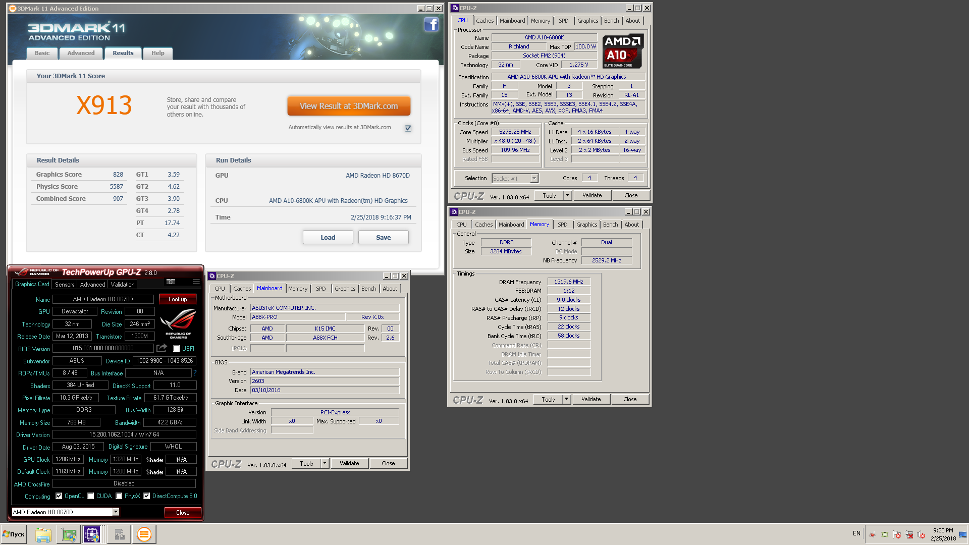 Тестовый стенд Дмитрия был построен на базе материнской платы ASUS A88X-Pro и включал четыре гигабайта оперативной памяти DDR3 производства G.Skill. Сам гибридный процессор A10-6800K был разогнан до ~5278 МГц (+28,7%), а рабочая частота графического ядра Radeon HD 8670D находилась в районе 1286 МГц (+52,4%).