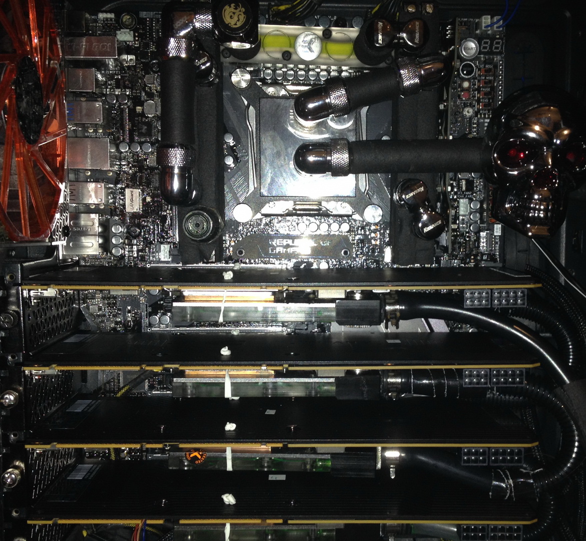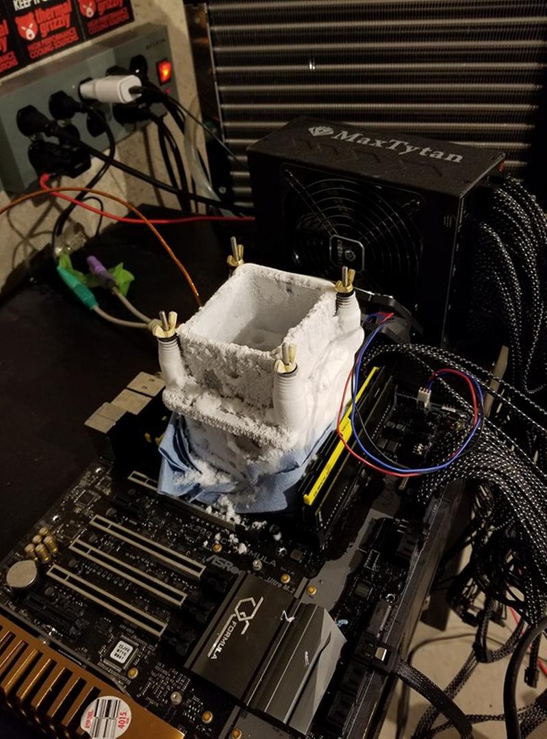 Среди зарубежных оверклокеров в прошлом месяце отличился американский энтузиаст H20 vs LN2. В его распоряжении оказались четыре видеоускорителя Nvidia Titan V, с помощью которых удалось завершить бенчмарк GPUPi – 1B всего 991 мс, а также пройти GPUPi – 32B за одну минуту и 9,425 секунды. «Сердцем» тестового стенда выступал 18-ядерный процессор Intel Core i9-7980XE, разогнанный до 5,199 МГц, а для охлаждения CPU и GPU применялась система жидкостного охлаждения.