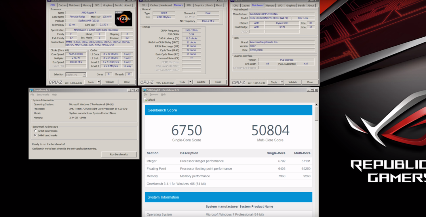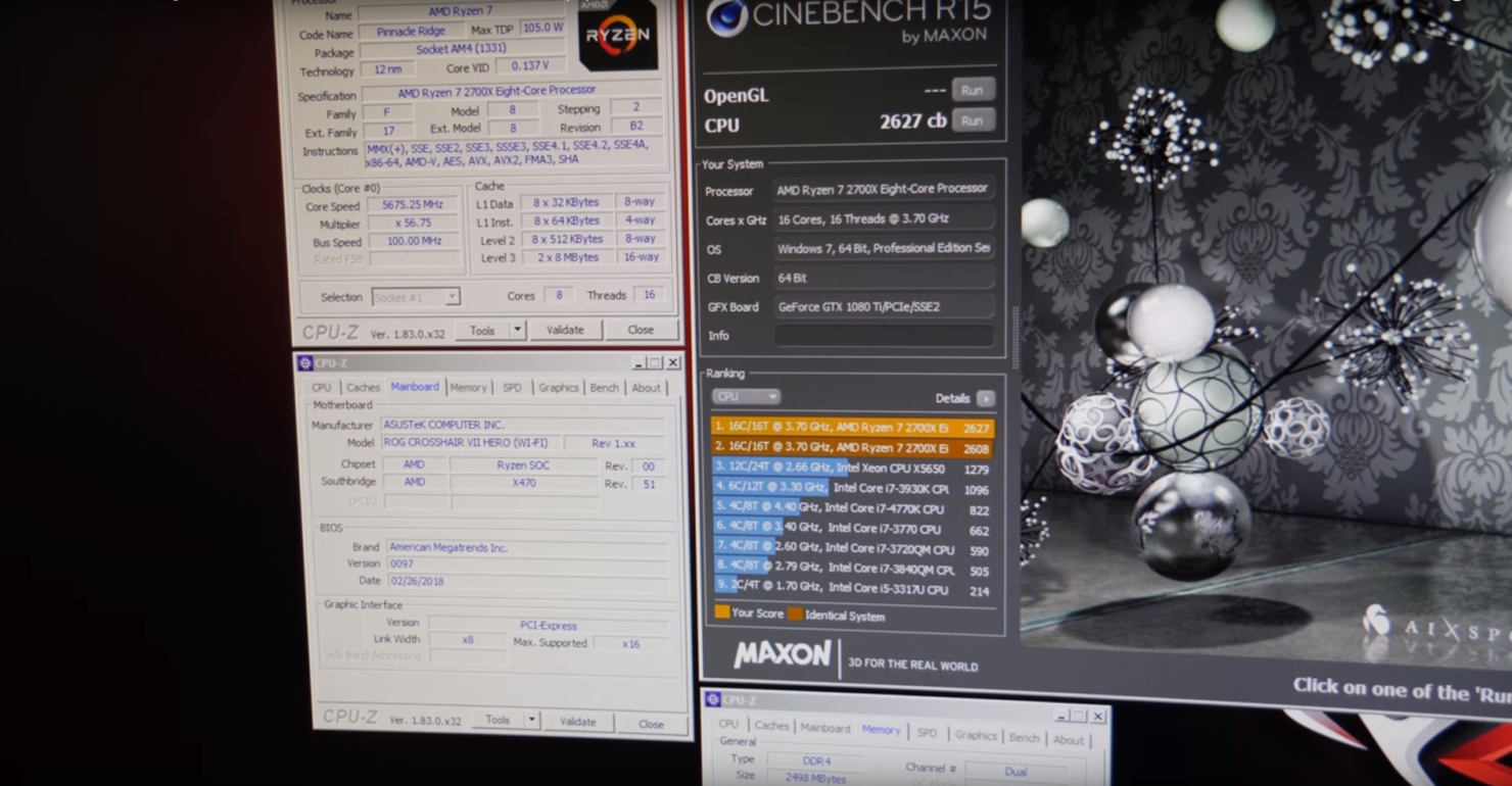 Кроме того, внимания также заслуживают впечатляющие результаты Ryzen 7 2700X, разогнанного до 5675 МГц, в бенчмарках Cinebench R15 и Geekbench 3. В первом случае ему удалось набрать 2627 баллов, а второй тест он завершил с результатом в 6750 очков в однопоточном режиме и 50804 балла при использовании всех ядер. Для сравнения, восьмиядерный Intel Core i7-7820X@6115 МГц в руках американского энтузиаста Splave прошёл второй бенчмарк с 6475 и 50725 баллами соответственно.