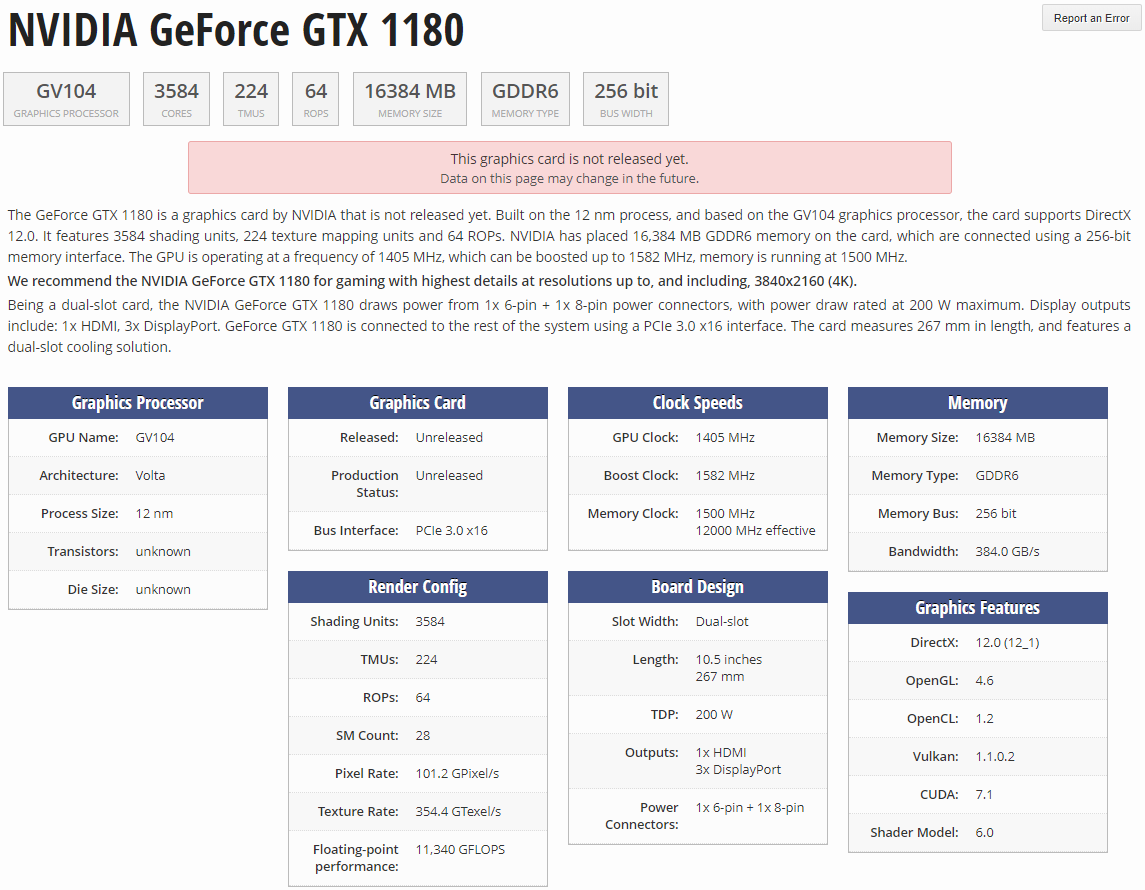В базе данных веб-ресурса TechPowerUp, также использующейся утилитой GPU-Z, на днях появилась страница с предварительными характеристиками видеокарты Nvidia GeForce GTX 1180. Основой новинки, по информации зарубежных коллег, является 12-нм графический процессор GV104 на базе архитектуры Volta, в распоряжении которого имеются 3584 ядра CUDA, 224 текстурных блока (TMU) и 64 блока рендеринга (ROP).