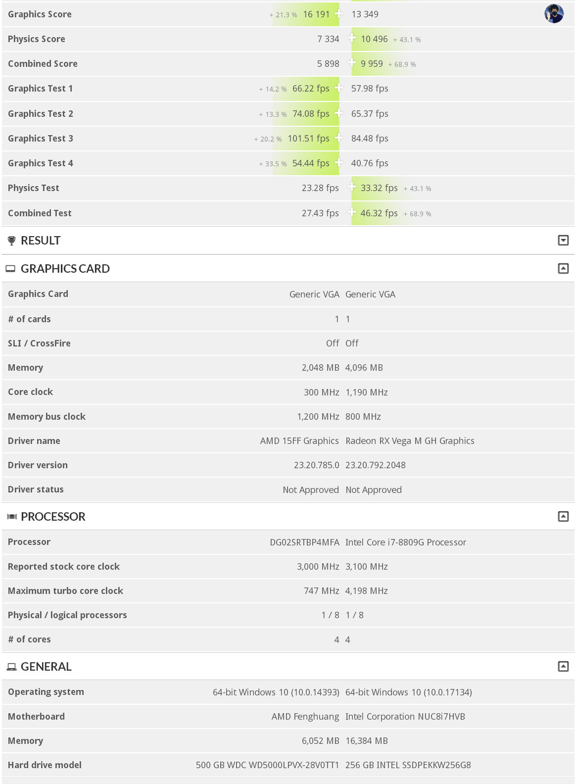 Что касается самих результатов, то на роль соперника AMD Fenghuang 15FF был выбран процессор Intel Core i7-8809G с графическим ядром Radeon RX Vega M GH. По итогам 3DMark упомянутый гибридный процессор показал весьма впечатляющие результаты, существенно обогнав совместную разработку Intel и AMD в графических тестах и отстав в подтесте Physics, что легко объясняется низкой частотой ядер x86-64.
