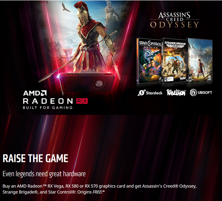 Компания AMD решила подогреть интерес к потребительским видеокартам серии Radeon RX и подарить покупателям своих графических ускорителей три игры для ПК. Речь идет о Star Control Origins, Strange Brigade и Assassin's Creed Odyssey, релиз которых запланирован на 20 сентября, 28 августа и 5 октября соответственно. Данное предложение особенно актуально на фоне снижения интереса к добыче криптовалют и, как следствие, возросшей доступности новых видеоадаптеров.