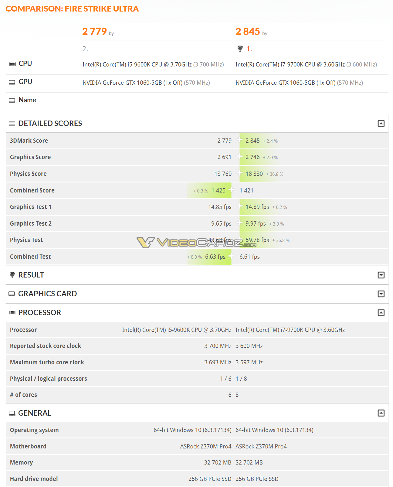 Кроме того, порталу VideoCardz удалось обнаружить в базе данных тестового пакета 3DMark Fire Strike Ultra результаты процессоров Intel Core i5-9600K (6 ядер/6 потоков, 3,7/4,5 ГГц) и Core i7-9700K (8 ядер/8 потоков, 3,6/4,9 ГГц). По результатам подтеста Physics, оценивающего «сырую» вычислительную мощность CPU, старший чип оказался на 36,8% быстрее соперника из линейки Core i5. В качестве основы тестового стенда выступила материнская плата ASRock Z370M Pro4.