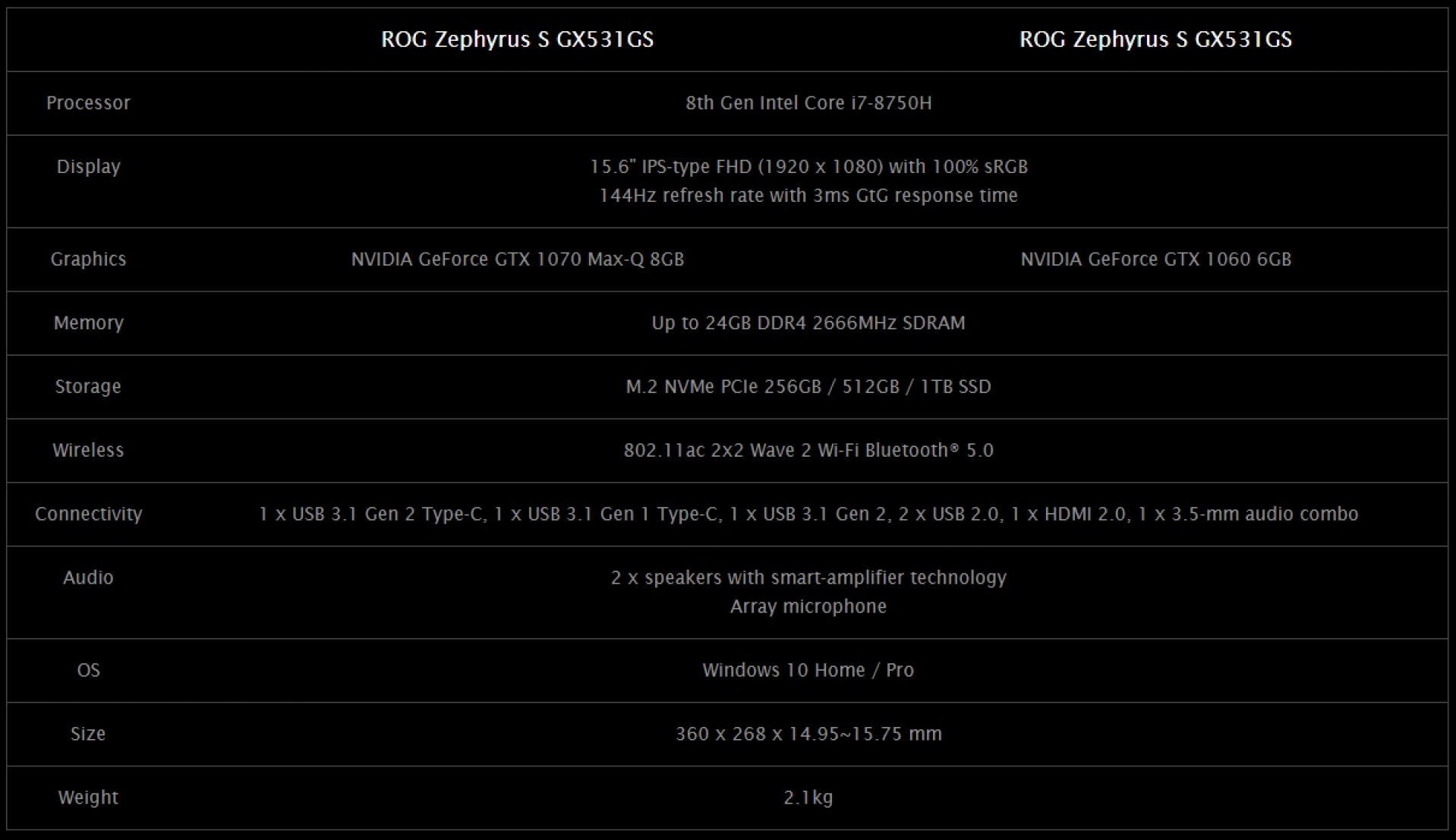 Лэптоп ASUS Zephyrus S будет доступен в двух вариациях: с видеокартой Nvidia GeForce GTX 1060 6 GB Max-Q или GeForce GTX 1070 8 GB Max-Q. Остальные технические характеристики идентичны: центральный процессор Intel Core i7-8750H (6 ядер/12 потоков, 2,2/4,1 ГГц), до 24 Гбайт оперативной памяти DDR4-2666, NVMe-накопитель в формате М.2 объемом от 256 Гбайт до 1 Тбайт, 15,6-дюймовый экран на базе IPS-матрицы с разрешением 1920х1080 пикселей, частотой обновления 144 Гц и 100-процентным охватом палитры sRGB.