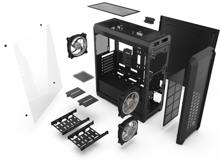 В верхней и передней частях корпуса имеются посадочные места под радиаторы СВО типоразмеров 120 мм, 240 мм, 280 мм и 360 мм, причем последние два могут быть установлены только спереди. На панели ввода-вывода доступны два порта USB 3.0, пара 3,5-мм аудиогнёзд, слот кард-ридера SD/microSD, а также трёхпозиционный (12/5/0 В) переключатель скорости вращения вентиляторов и кнопка управления подсветкой.