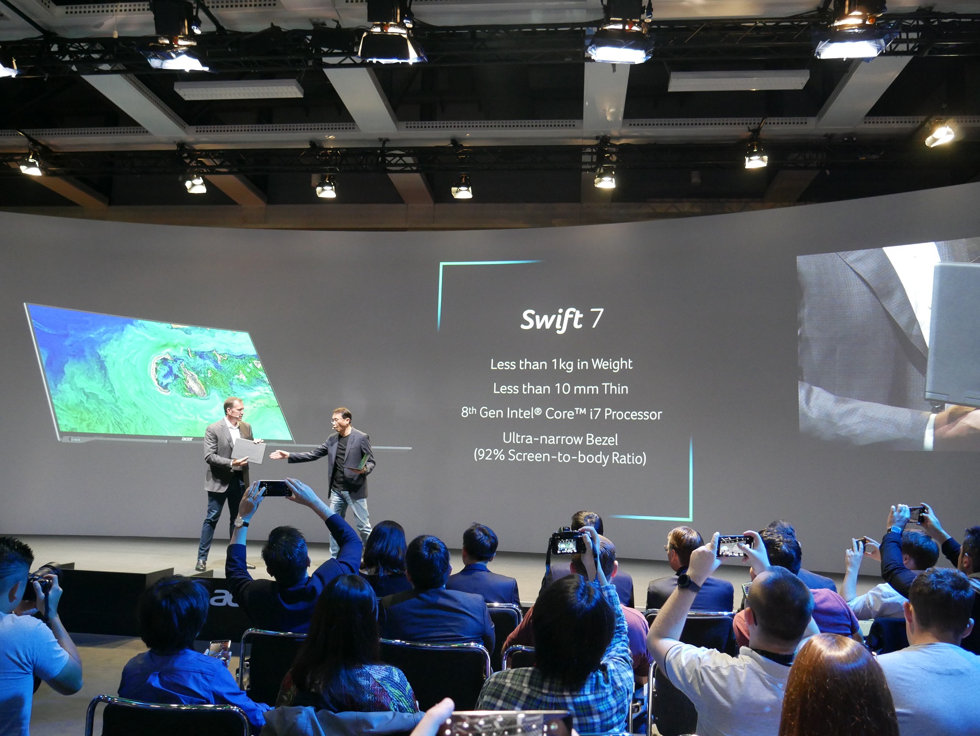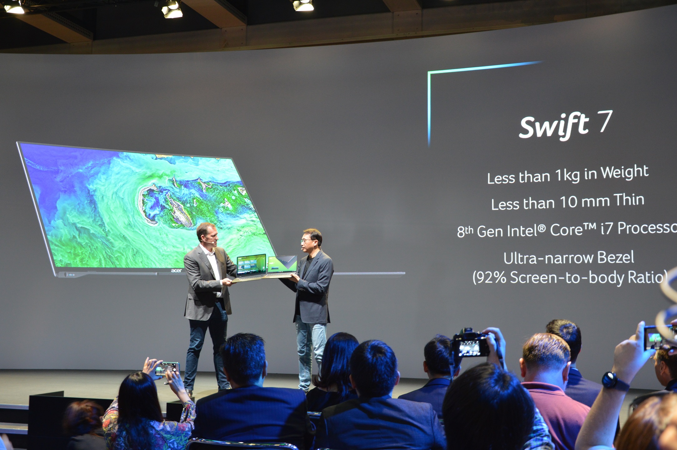 Помимо геймерских устройств линеек Predator и Nitro на вчерашней пресс-конференции next@acer немало внимания было уделено обновлённым версиям ноутбуков Aspire 7 и Swift 7. Первый лэптоп «перекочевал» на процессоры Intel Kaby Lake-G, оснащаемые графическим ядром Radeon Vega M, а второй получил экран со сверхтонкими рамками и стал ещё компактней.