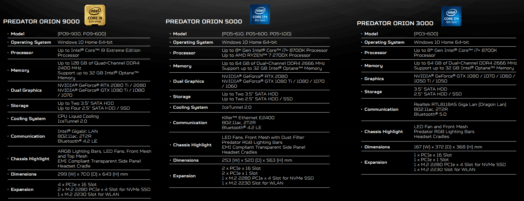 Кроме того, Acer рассказала про небольшое обновление модельного ряда геймерских декстопов Predator Orion. Основные технические характеристики, касающиеся опций центрального процессора, памяти, накопителей и систем охлаждения не изменились по сравнению с прошлогодними моделями. Единственным нововведением стала поддержка видеокарт Nvidia GeForce RTX компьютерами Predator Orion 9000 и Predator Orion 5000.